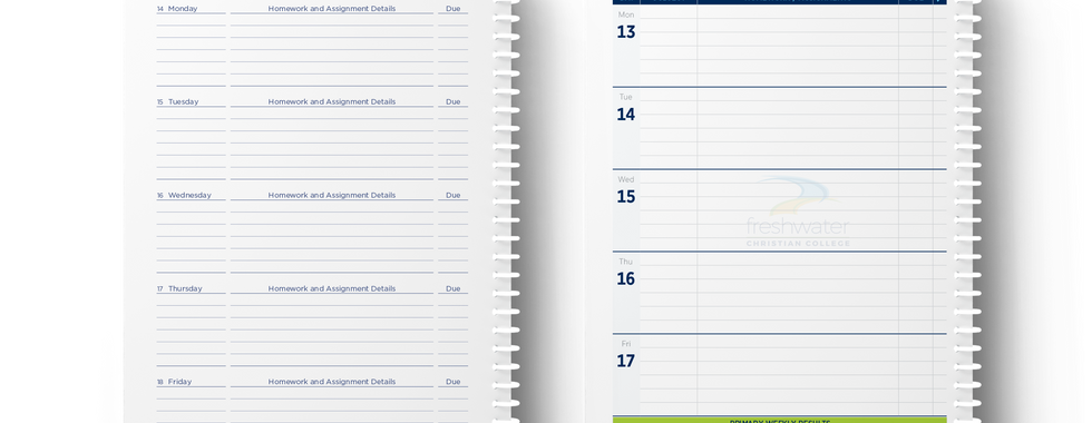 In their weekly date section, Freshwater Christian College wanted their primary campus to have more structure, so we included a weekly check-in that measured spelling, maths, behaviour, and memory verse alongside a Teacher/Guardian signature box.